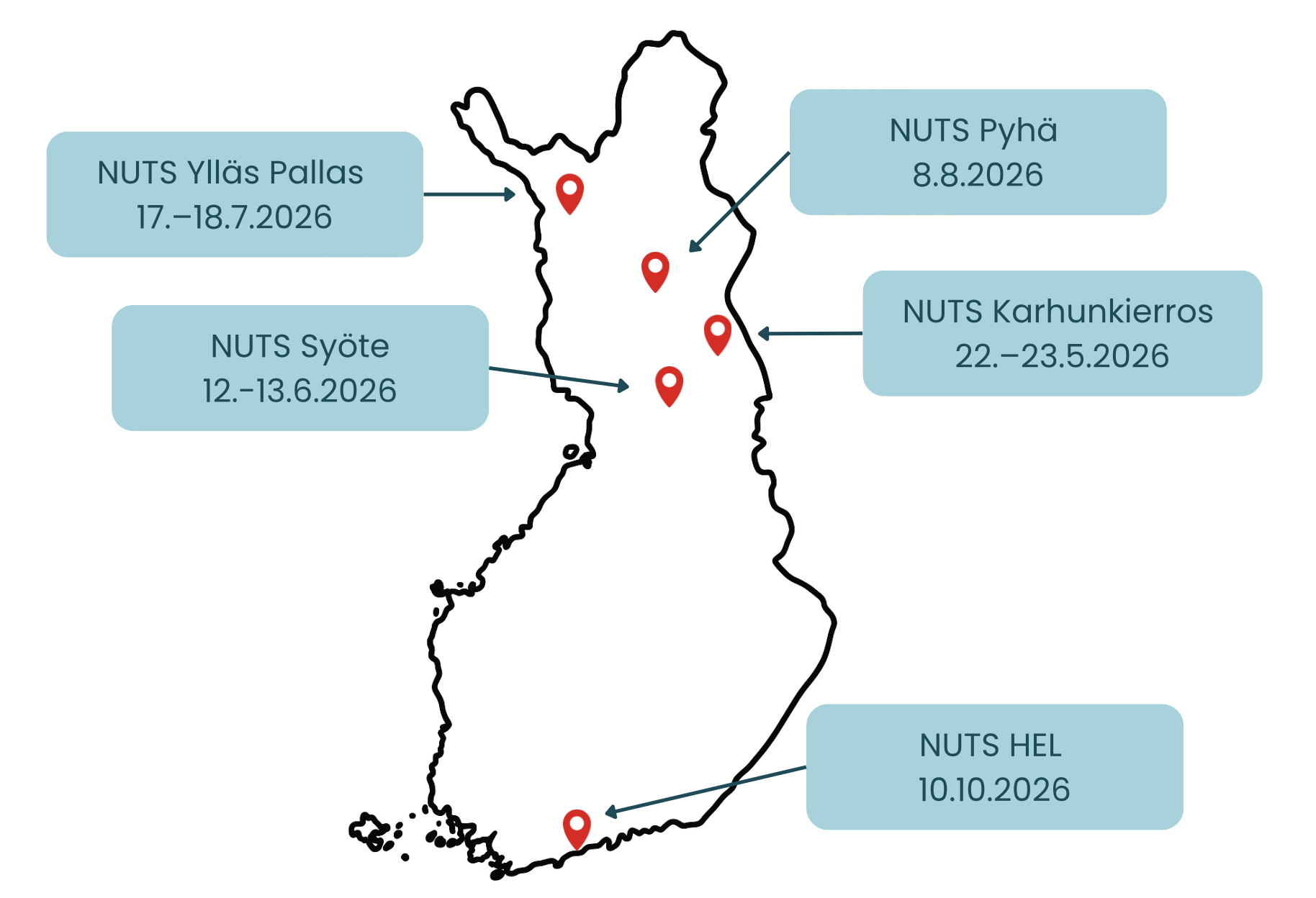 NUTS-tapahtumat vievät polkujuoksijat Suomen upeimpien kansallispuistojen huikeisiin maisemiin. Tapahtumavaihtoehtoja löytyy keväästä syksyyn ja Etelästä Pohjoiseen. Tutustu tarkemmin ja valitse oma tapahtumasi!